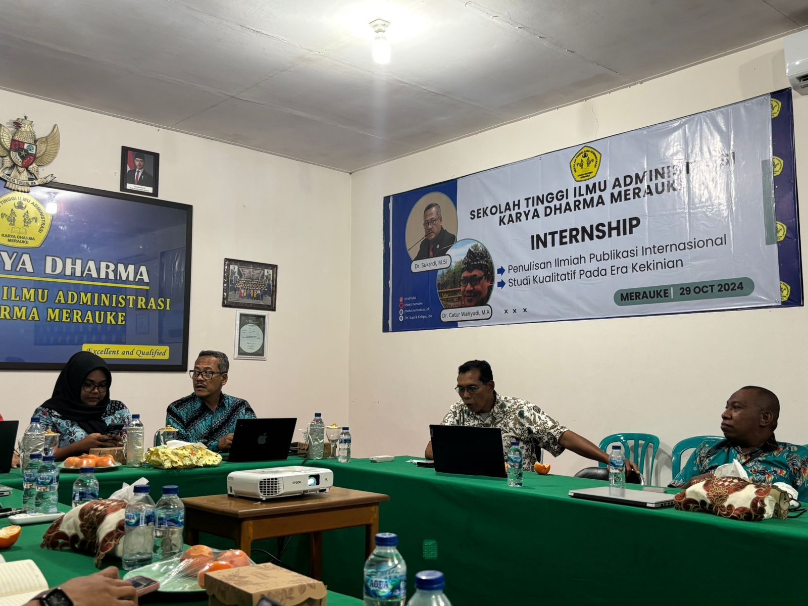Intership yang diadakan oleh STIA Karya Dharma sebagai bentuk awal dari penandatanganan MoU bersama Universitas Merdeka Malang. Program internship ini bertujuan untuk membekali peserta dengan keterampilan yang diperlukan untuk menghasilkan publikasi ilmiah internasional berkualitas tinggi, khususnya dalam ranah studi kualitatif. Para Dosen diajak untuk mendalami metodologi penelitian kualitatif terkini, teknik penulisan ilmiah yang efektif, serta strategi publikasi di jurnal internasional bereputasi.